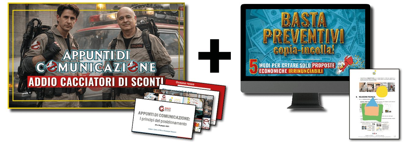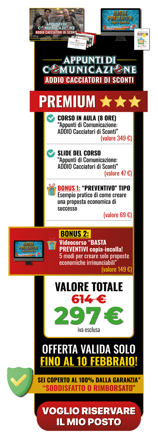- il videocorso "BASTA PREVENTIVI copia-incolla! 5 modi per creare proposte economiche irrinunciabili" (riceverai una e-mail con il link di accesso alla piattaforma così potrai guardarlo quando, quante volte e da dove vuoi, in preparazione al corso in presenza in aula)