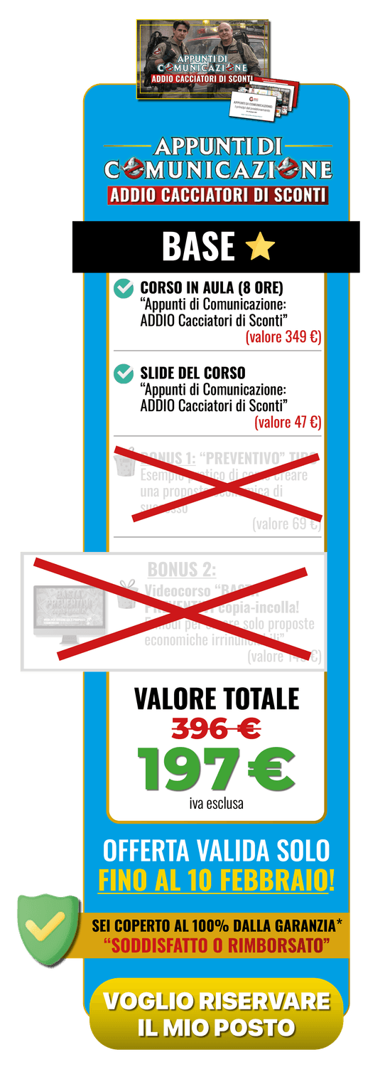 Slide del corso "Appunti di Comunicazione: ADDIO Cacciatori di Sconti"(valore 47 €)